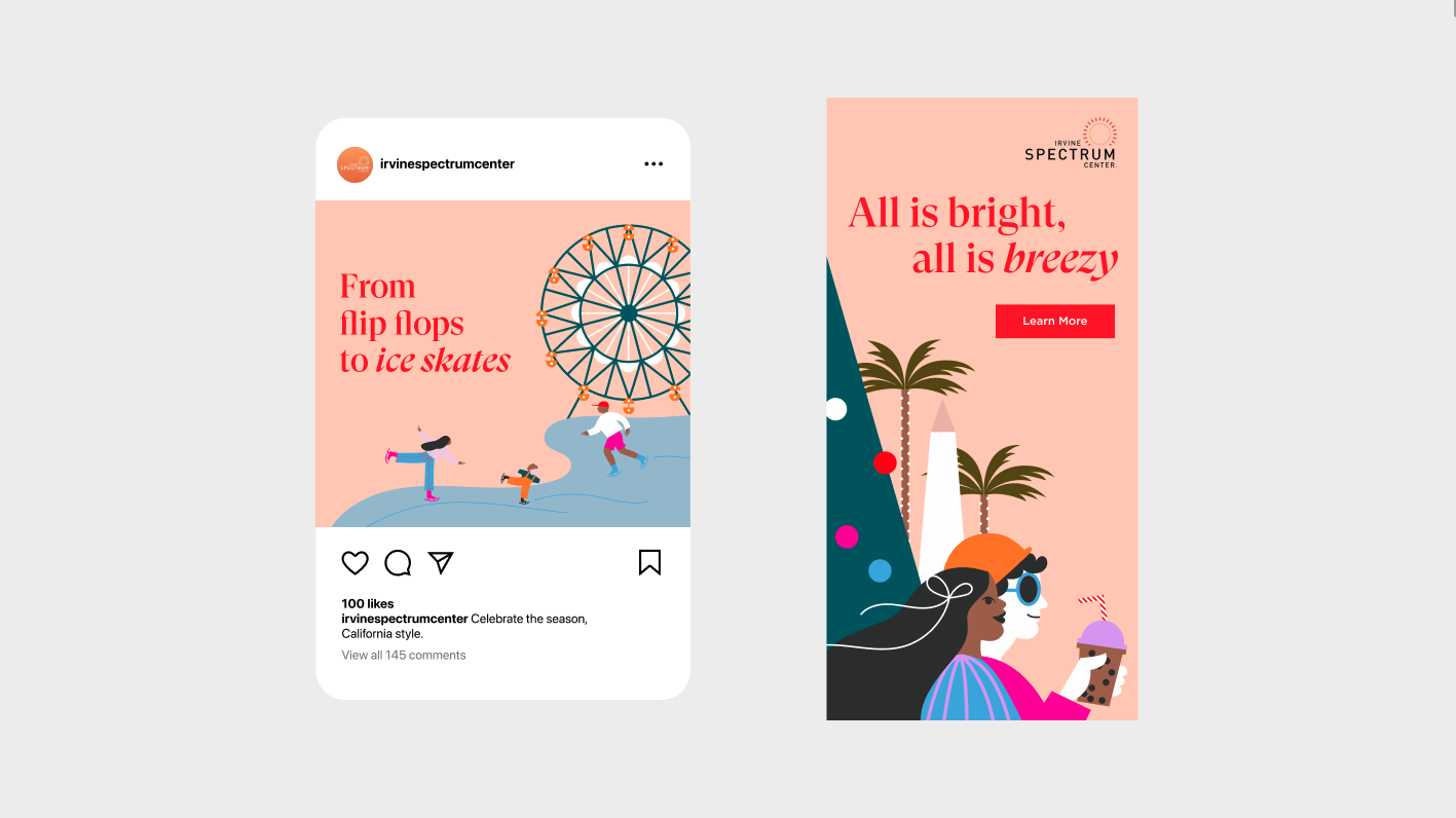 While the “Let’s Holiday” campaign lived in all Irvine Retail Co. shopping locations in California, we created sub-campaigns for their 3 biggest centers.