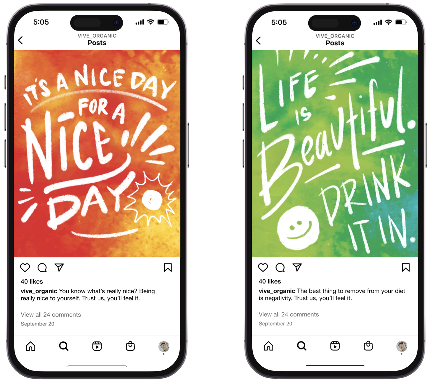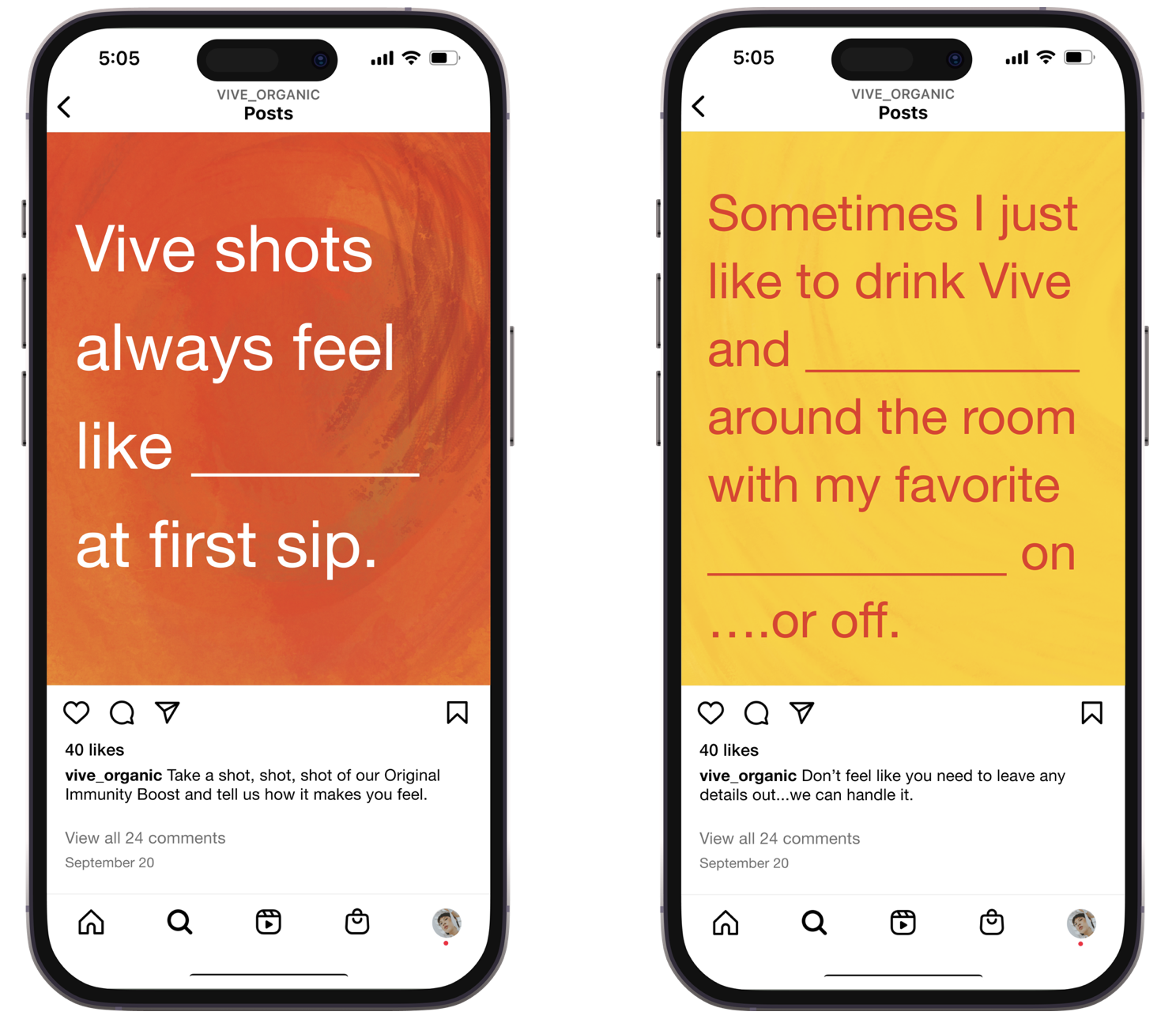 The refreshing feeling of Vive is so invigorating and so effective that there’s not one way to describe it. By creating shot-sized Mad Libs-style posts, we pass the mic to our users and give them the power to put all the feels of Vive into their own words.